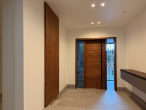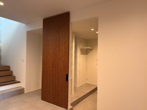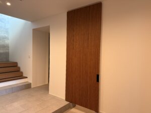 写真をよくご覧下さい。この引戸、本来有るべきレールの車輪もありません。 まさに宙に浮いている不思議なドアです。この“TRICK”を知りたい方はぜひお問い合わせを。 もちろん玄関も含めてミャンマーチークで製作しました。